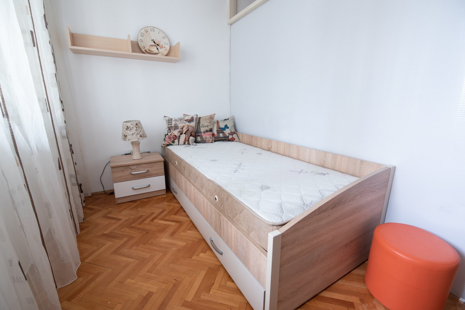 Izdaje se kompletno namješten dvosoban stan u Ulici Ivana Vujoševića, Preko Morače. Stan ima 90m2 i pozicioniran je na prvom spratu. Struktura stana sastoji se od: ulaznog hodnika, dnevne sobe, trpezarije, špajiza, dvije spavaće sobe (jedna soba je podijeljena na dvije jednokrevetne sobe), dva kupatila, i dva balkona. Primarna orjentacija stana je zapad-istok. Stan se izdaje na duži vremenski period uz obavezan depozit. Cijena mjesečnog zakupa je 600e.