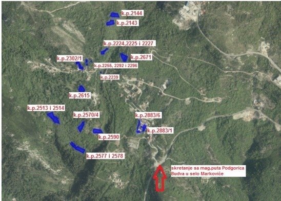 Na prodaju ukupno 9 nezavisnih katastarskih parcela u mjestu Markovići, iznad Budve. Lokacija je 6km od Budve ka Cetinju. Mogu se prodavati pojedinačno, cijena zavisi od same pozicije parcele, pristupnog puta, pogleda na more…Pojedinačno parcele su od 451m2 do 1.800m2